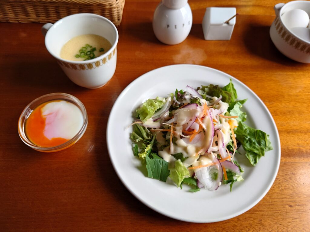 サラダ、スープ、温泉卵が付きます。